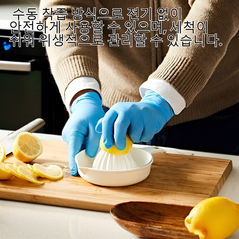 ● 휴대성이 뛰어난 미니 사이즈로 어디서든 신선한 과일 주스를 간편하게 착즙할 수 있어 밀크티 및 다양한 음료에 활용도가 높습니다. ● 수동 착즙 방식으로 전기 없이 안전하게 사용할 수 있으며, 세척이 쉬워 위생적으로 관리할 수 있습니다. ● 내구성이 우수한 소재로 제작되어 반복 사용에도 변형 없이 오랜 기간 사용 가능하며, 과일 본연의 맛을 그대로 살려줍니다. ● 주스 믹서로 과일, 채소 등 다양한 재료를 손쉽게 착즙할 수 있어 건강한 음료를 원하는 분들에게 추천합니다. ● 가벼운 무게와 컴팩트한 디자인으로 캠핑, 여행 등 야외활동 시에도 부담 없이 휴대할 수 있습니다.